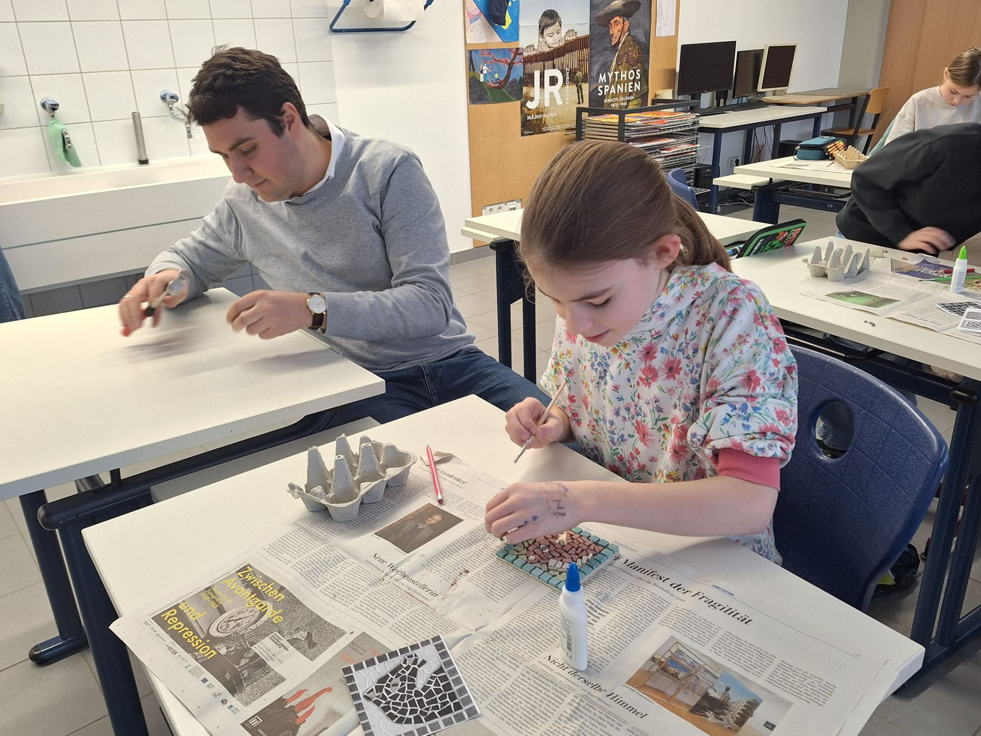 Für die Fünftklässler gab es parallel vier tolle Angebote: Römisch Kochen in der Schulküche, wo in vergnügtem Teamwork Globi (Quarkbällchen) mit Gustum de Praecoquis (Aprikosenmus mit Stückchen) und Moretum (Schafskäseaufstrich) entstanden und auch mit Appetit verzehrt wurden. Eine Mosaikwerkstatt im Zeichensaal, wo sie in geduldiger Kleinarbeit schöne Motive zusammensetzten.