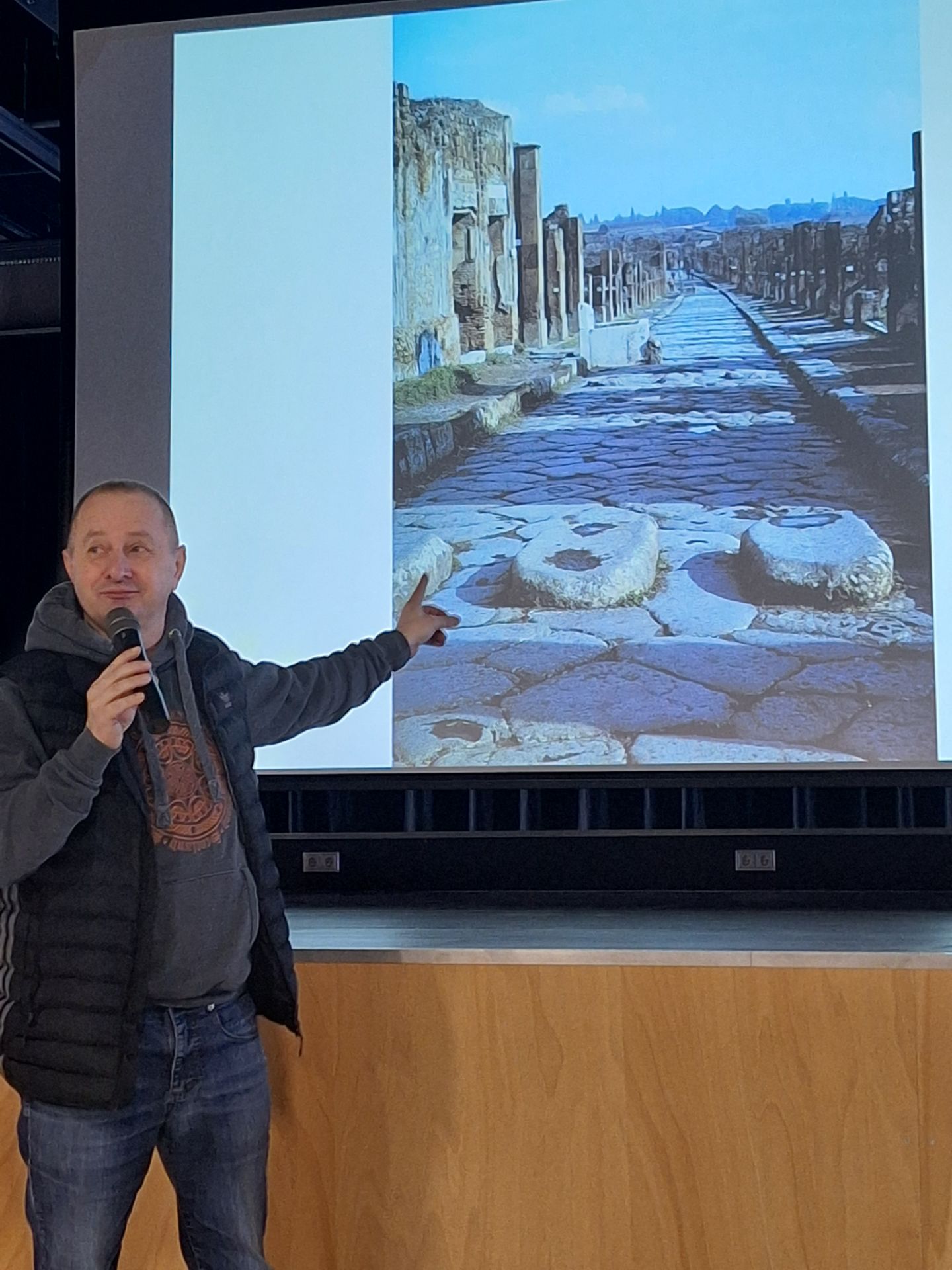 Inzwischen entführte der Archäologe Mario Becker von der Goethe-Universität Frankfurt unsere Achtklässler in die Antike: In lebendigem und kommunikativem Vortragsstil stellte er die Gründe für Aufstieg und Niedergang des römischen Reiches dar und begeisterte unsere Achtklässler für die Leistungen der Römer. Für den überraschenden Niedergang des weströmischen Reiches seien jahrzehntelange Schlechtwetterperioden infolge von schwersten Vulkanausbrüchen mit verantwortlich gewesen; das habe man nur durch die Analyse von geologischen Proben erkennen können: Zwischen 160 und 170 n.Chr. seien der Taupo und um 232 der Vulkan Hatepe auf Neuseeland ausgebrochen und hätten die Erd-Atmospäre für Jahrzehnte verändert. In deren Folge hätten zahlreiche Germanenstämme – bedrängt von Goten und Hunnen- ihre angestammten Siedlungsgebiete verlassen, weil ihnen die Lebensgrundlage genommen worden seien. Wir würden das heute als Migration aus wirtschaftlichen Gründen bezeichnen. Damals waren allerding alle Männer bewaffnet und deswegen eine Bedrohung für jedes Reich. Diese hätten dann gleichzeitig von vielen Seiten die Ostgrenze bedroht, während der Zusammenschluss der Alemannen dann etwas später von Norden her noch gefährlicher für das römische Reich geworden sei.