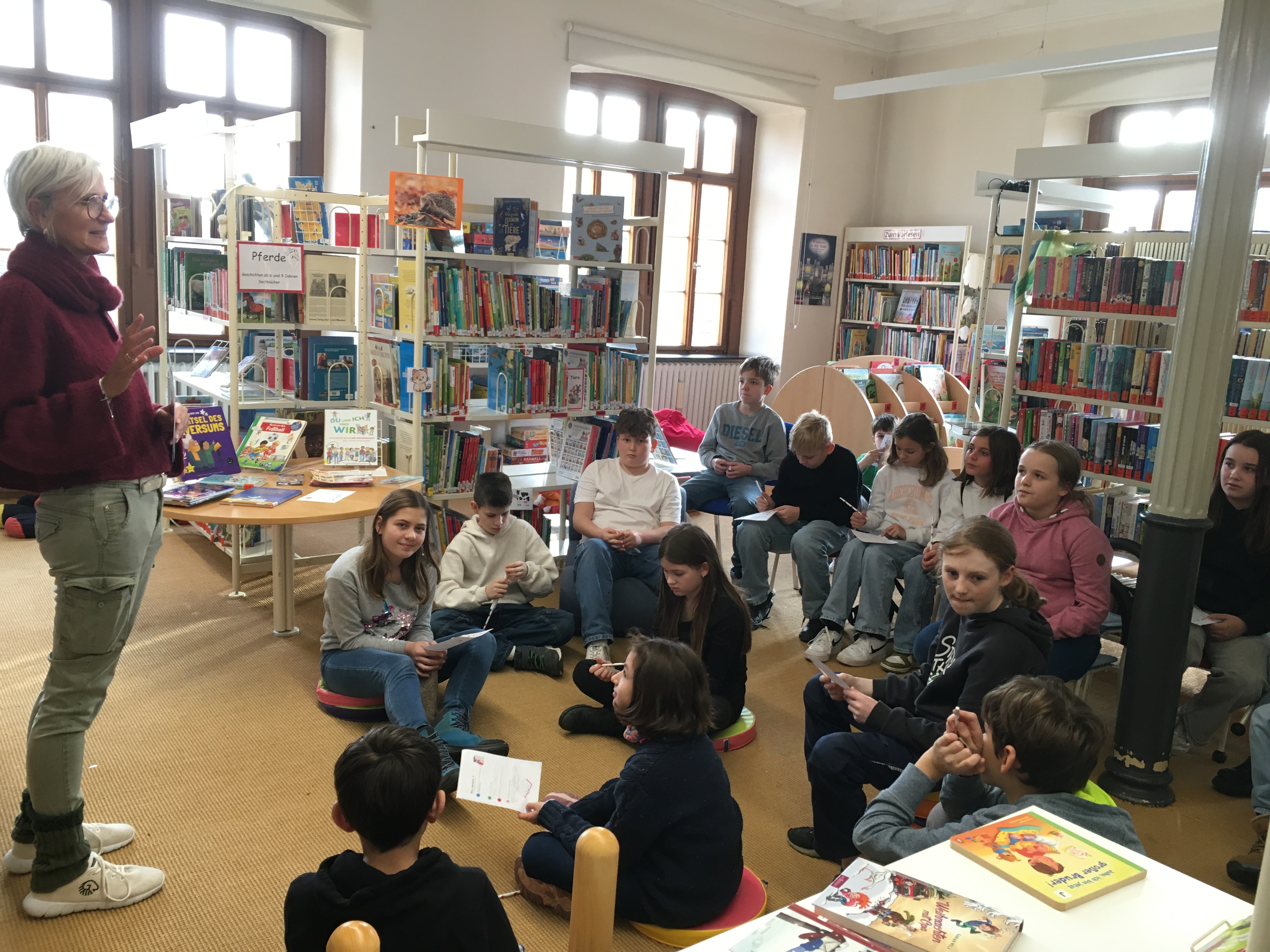 Nun konnten die Fünftklässler im Rahmen des Deutschunterrichts auch die Stadtbibliothek im Alten Rathaus genauer kennenlernen. Für manche war es der erste Besuch, andere wiederum fühlen sich im historischen Gebäude am Marktplatz bereits seit der Kindergartenzeit heimisch. Für alle Kinder jedoch waren die Informationen durch die aktuelle Leitung, Heike Burk, gewinnbringend. Sie erklärte die jeweiligen Angebote an Büchern und Medien im Foyer, im Lesesaal und den einzelnen Stockwerken, wobei vor allem der neu gestaltete Jugendbuchbereich im dritten Stock Zustimmung erhielt. In der anschließenden Rallye, die die Kinder noch einmal durch das ganze Haus führte, konnten die Schüler ihr Wissen, ihr Kombinationsvermögen und ihre Recherchekompetenz unter Beweis stellen. Beim Vergleich der Ergebnisse bestand noch einmal die Möglichkeit, Fragen zu stellen. Gerne nahmen die Fünftklässler die Preise - Bleistifte und Lesezeichen - entgegen.